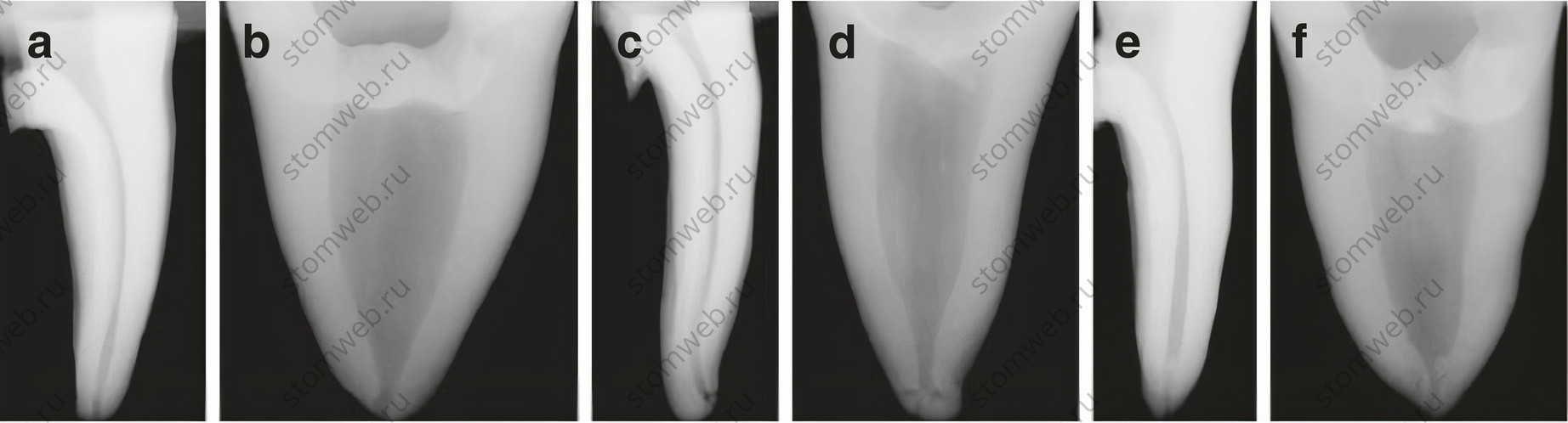 Рисунок 4. Щёчно-язычные (а, c, e) и мезио-дистальные (b, d, f) рентгенологические проекции трех мезиальных корней различных моляров нижней челюсти, подчеркивающие различия в размерах корневых каналов в зависимости от угла просмотра.